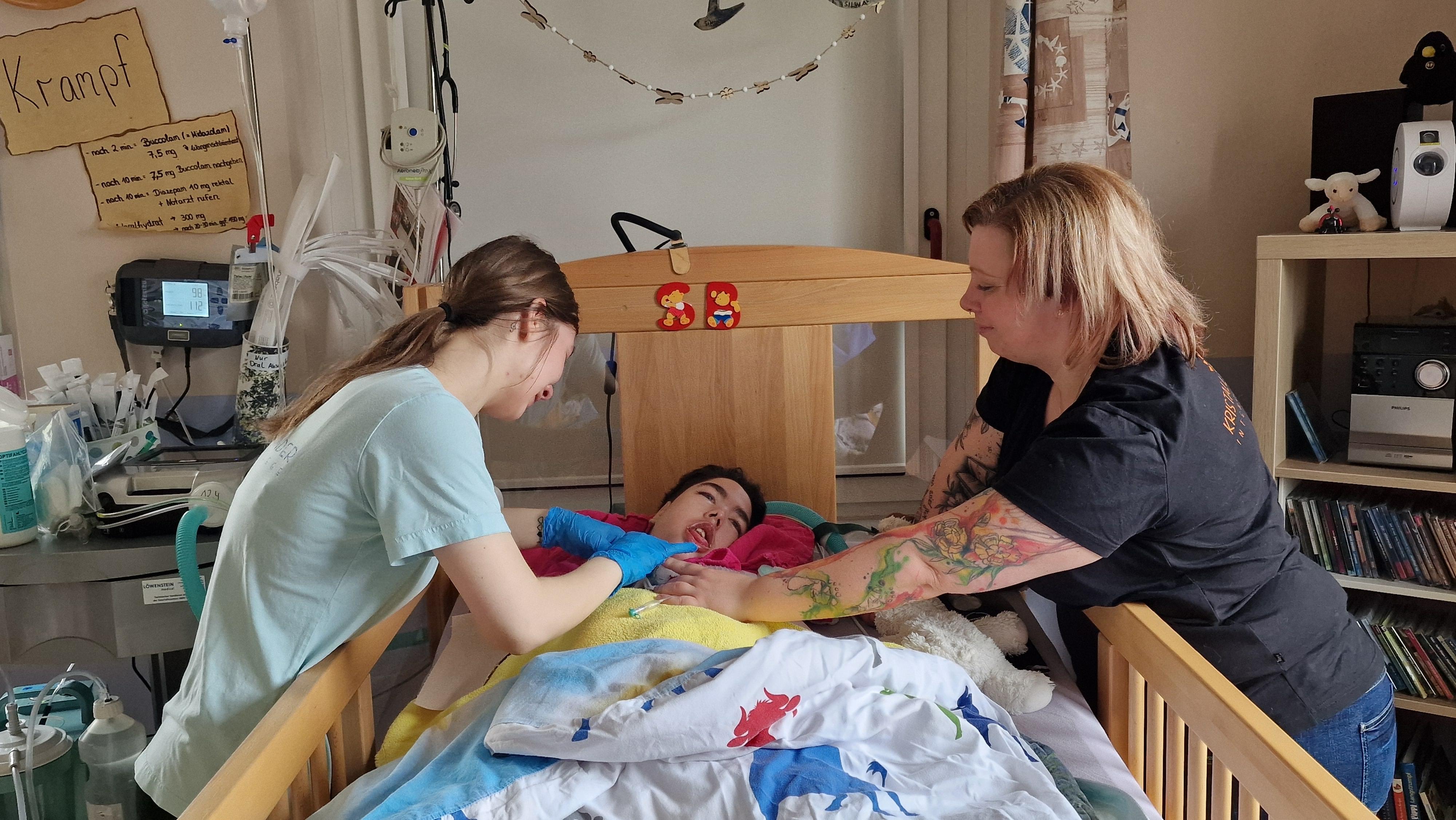 Auch die Pflege unserer anderen Kinder, z. B. der großen Jungs macht mir Freude. Vor allem, wenn ich merke, dass durch meine Pflege ihr Zustand gebessert wird, wenn z. B. Sekret mobilisiert wird oder sie entspannen können. Es verhält sich ein bisschen wie ein Rätsel, welches immer wieder aufs Neue zu lösen gilt. Was tut dem Kind heute gut, was mag es, womit entspannt es, was ist heute nicht so angebracht? Das herauszufinden und auf die kleinen feinen Zeichen der Kinder zu achten, immer aufmerksam zu bleiben und nichts als selbstverständlich hinzunehmen, das macht den Tag interessant und die Pflege immer wieder besonders!
